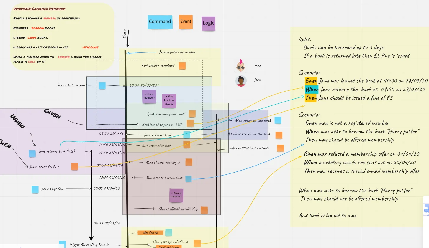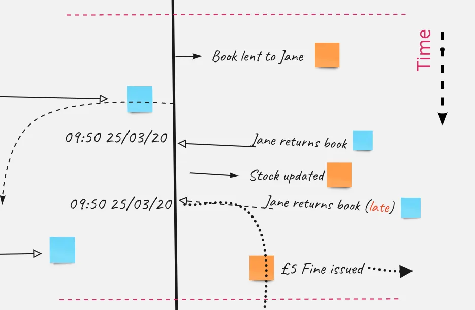 - An orange event sticky saying “Jon borrowed the book on the 21st Oct” (this could be event is dispatched on the 21st Oct.)