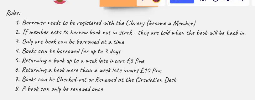 Each example is written down on sticky note and placed below the rule they illustrate. The examples should be as concrete as necessary to remove ambiguity from the rule that they are illustrating. Imagine we had a rule that says books can only be taken out for 2 days, otherwise a fine is issued. A relevant example used to illustrate this rule might be: “Jon attempts to return a book he took out 3 days ago”