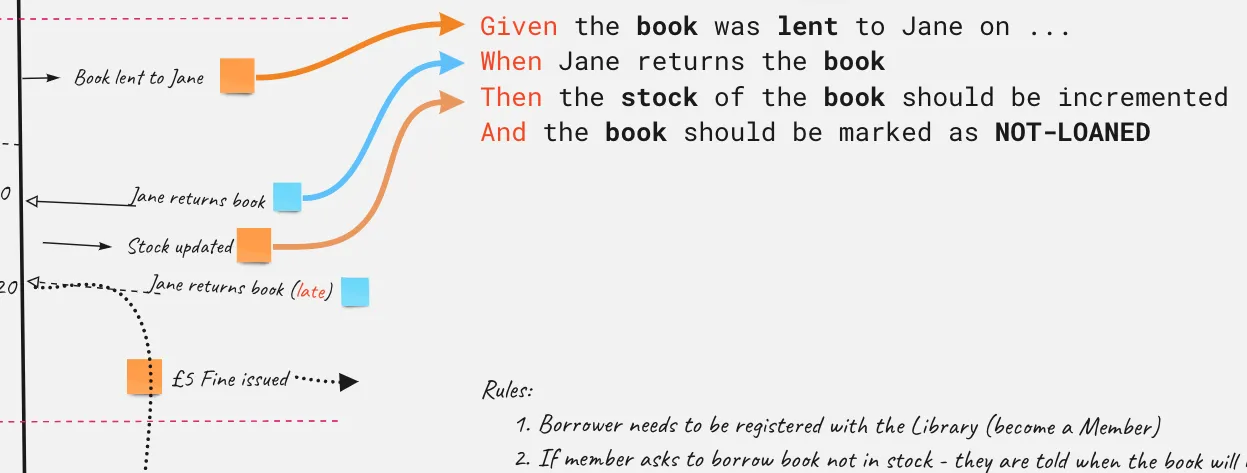 By sketching the events that happen in the system on to a downward-facing timeline, we can build up a mapping from events and commands directly to Gherkin scenarios. I’d encourage not thinking about the distinction between events and commands but rather just sketch-out “significant things” that happen over time. It will become quickly clear which are events and which are commands. The latter are, in-effect, how the user interacts with the system. For example, if the user is a library member, a command they might issue to the system would be “Return Book X”